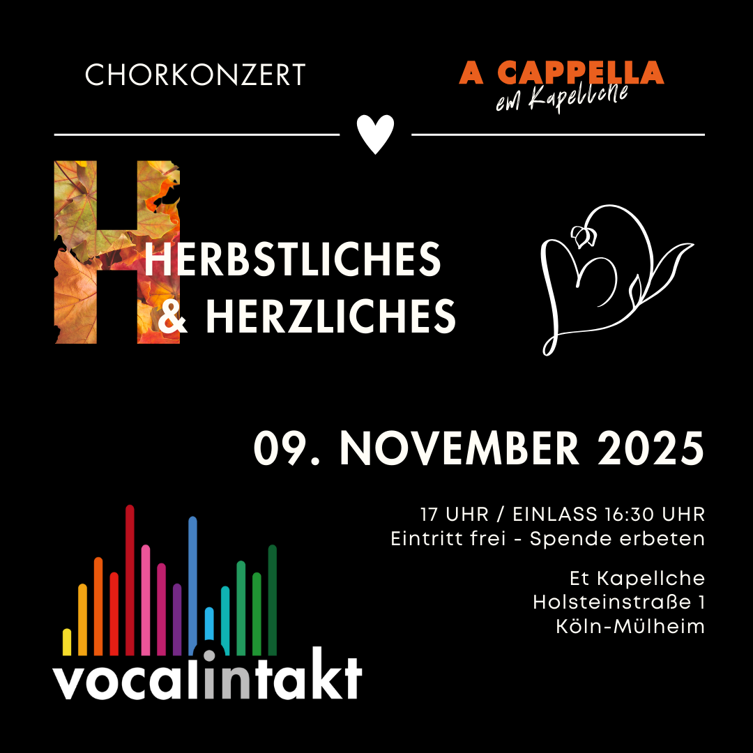 Unter dem Titel "Herbstliches und Herzliches" kehren wir am Sonntag, 9. November, um 17 Uhr (Einlass ab 16:30 Uhr) ins Kapellche zurück! Im bereits dritten Jahr in Folge freuen wir uns, euch ein Jahreskonzert in diesen ganz besonderen Räumlichkeiten präsentieren zu können. Beim Konzert erwarten Euch besinnliche und kraftvolle, klassische und etwas abgedrehte Songs, wie gewohnt in einem Genre-Mix quer durch die Zeiten, mit dem einen oder anderen "Wow"-Effekt!